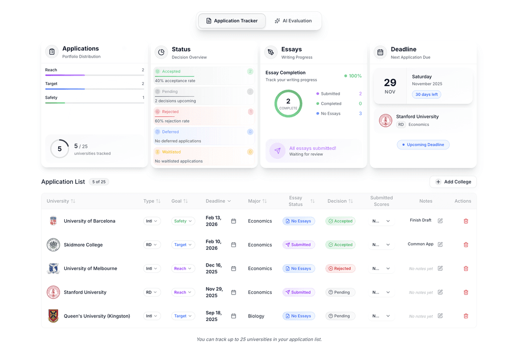Stay on top of every deadline, essay, and requirement with a unified tracker. Organize your reach, target, and safety schools, monitor progress, and never miss a step in your admissions journey.