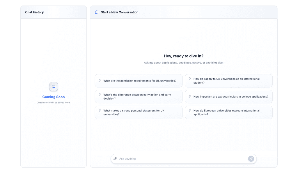 Your 24/7 admissions buddy. Ask anything — from “how do I apply to Stanford?” to “what’s a good SAT score?” — and it’ll give you real guidance, step-by-step, no fluff.