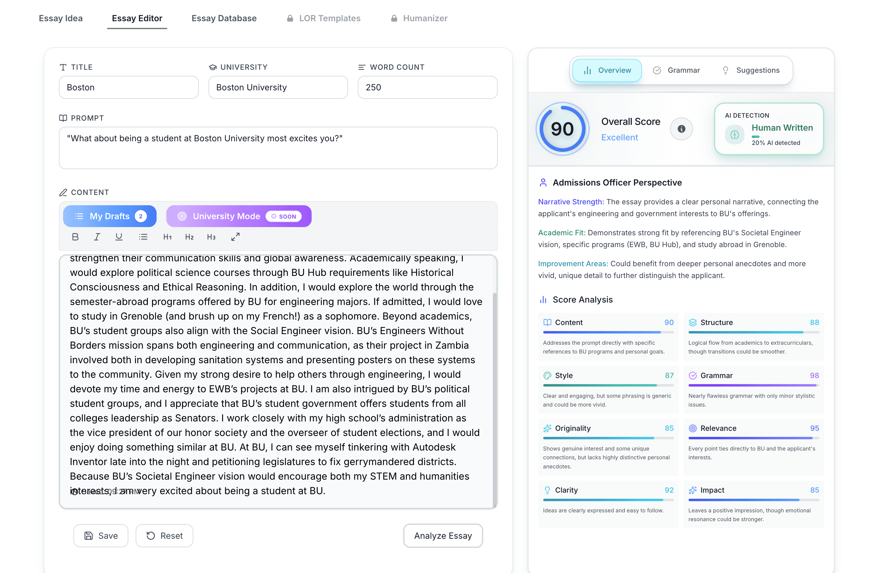Essay Checker with detailed AI admissions feedback.