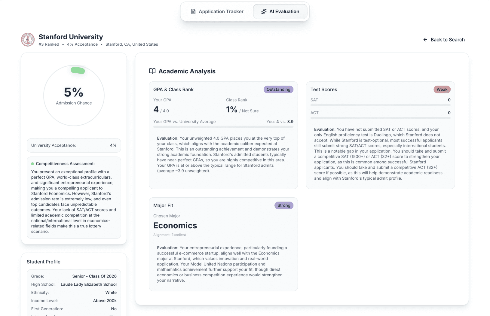AI Evaluation of your chances with clear strategies for improvement.