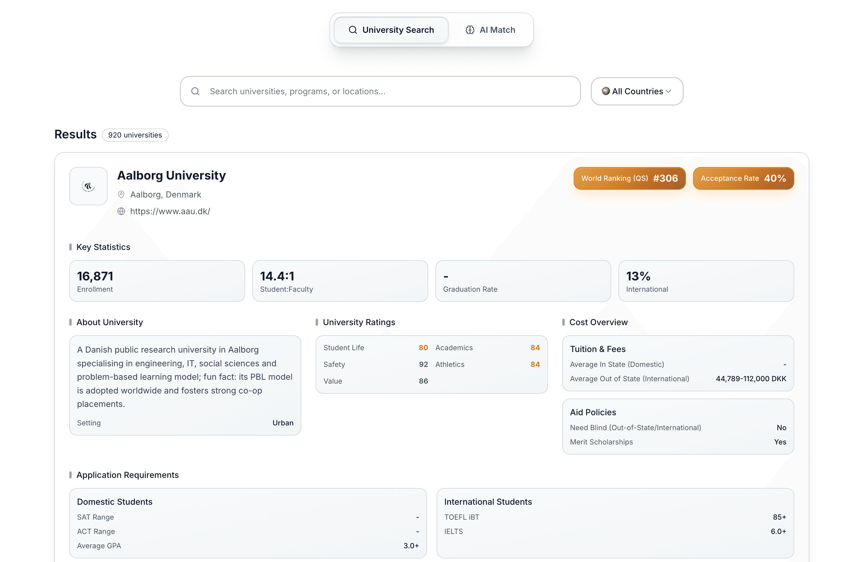Your one-stop to explore every university in detail - rankings, acceptance rates, requirements, costs, and more.